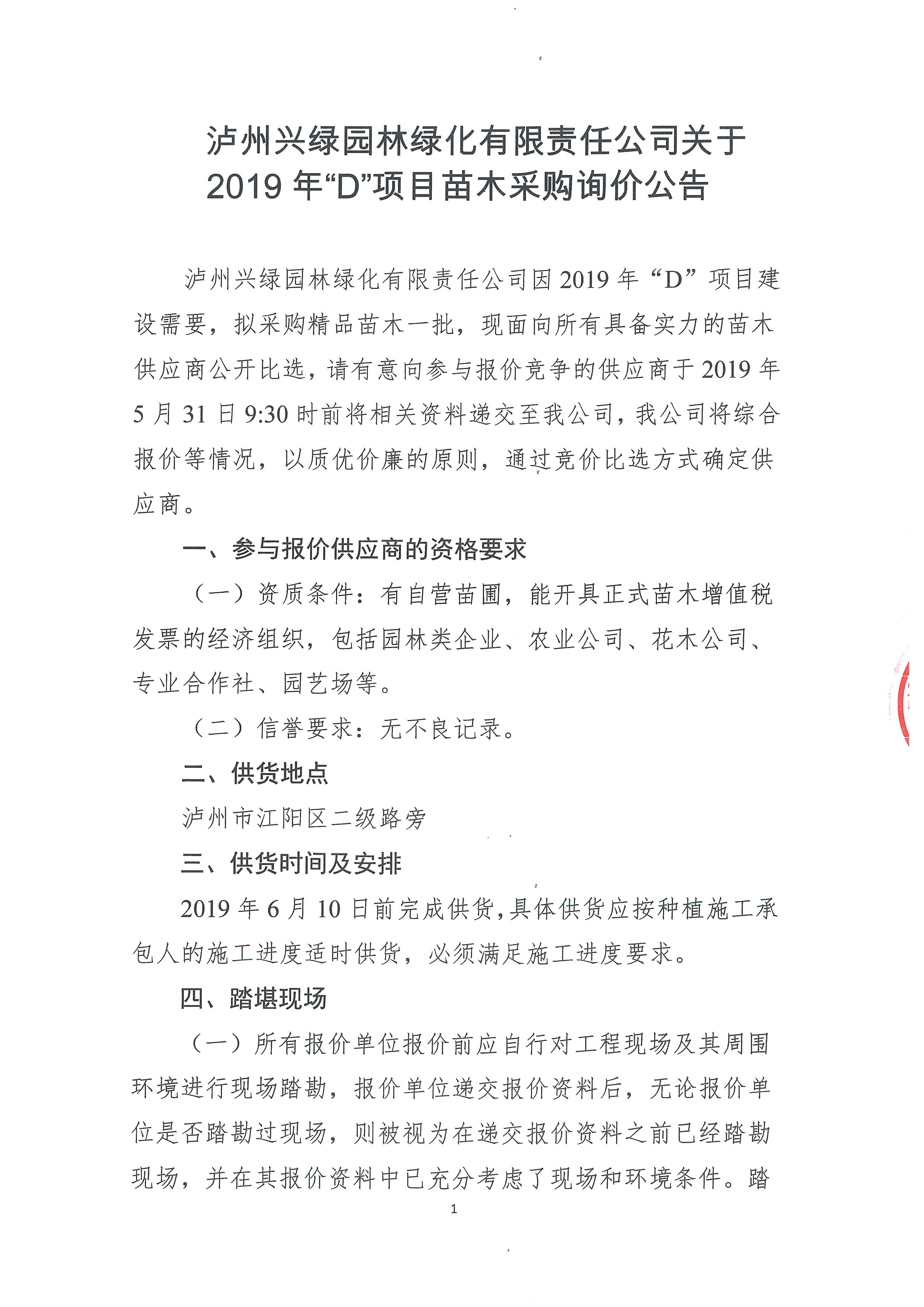 2019年“D”項目苗木采購詢價公告